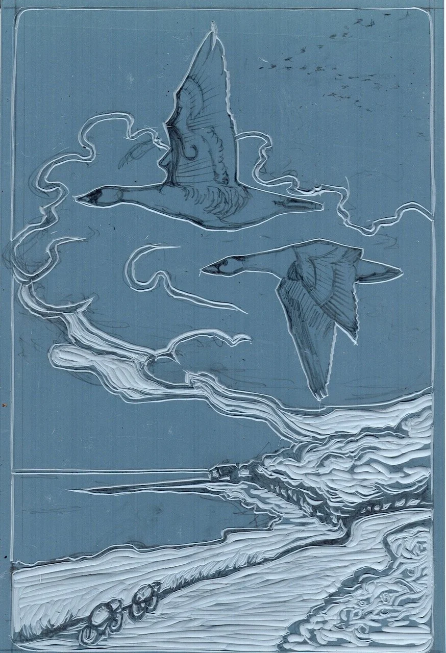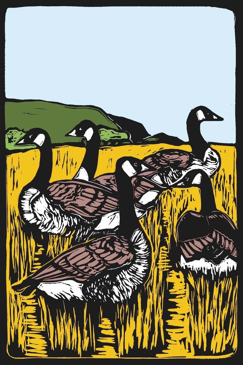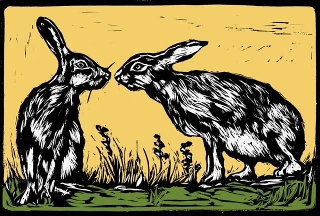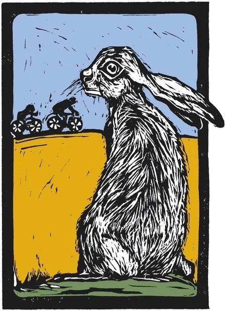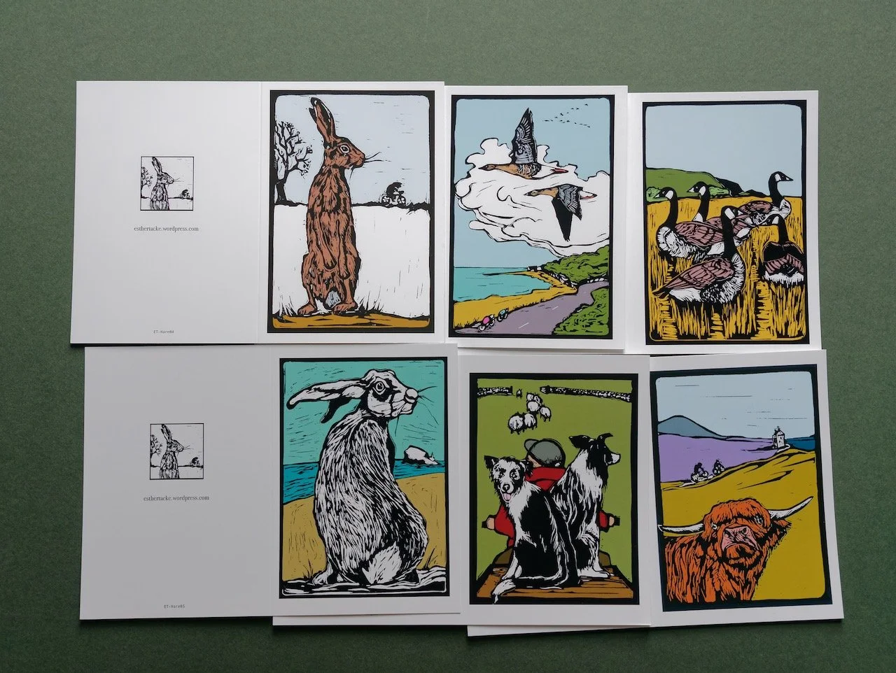 Each of the designs starts with a linocut. The images are then loaded into the computer where I add the colours. Having these digital images allows me to print the cards on very good paper, as a giclee print (on beautiful rag paper) or posters to any size.